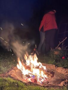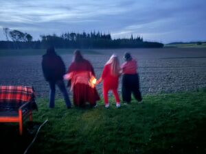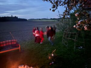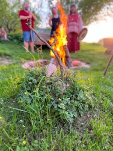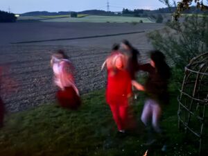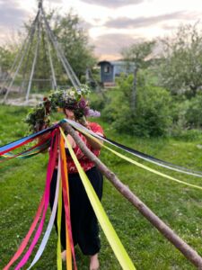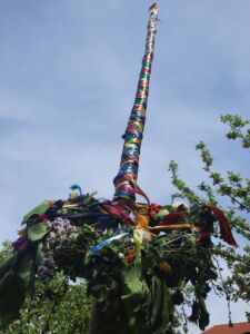 Bänder werden geflochten, lachend um den Maibaum getanzt, über seine Symbolik geschmunzelt, Stäbe werden geschnitzt und ums Feuer getanzt. Lieder gesungen und das Leben wird geehrt durch die sprühende Lebensfreude des werdenden Jahres.